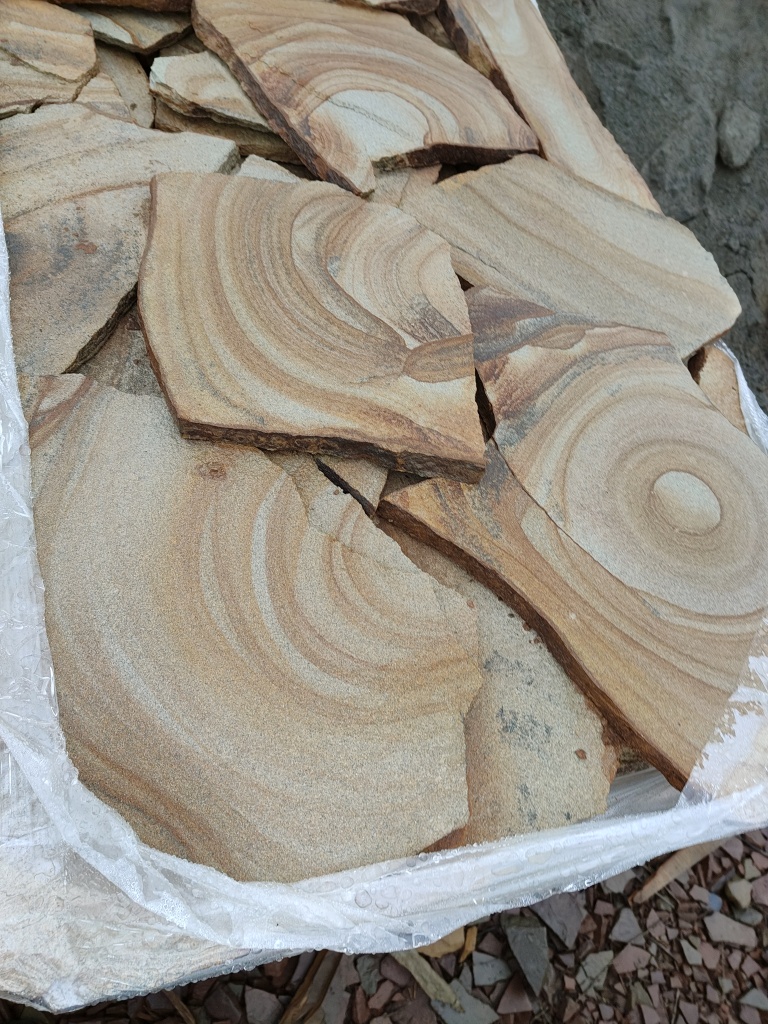 Песчаник жёлтый с разводами - для работ по облицовке цоколя, отмостки, стен, фундаментов, заборов.